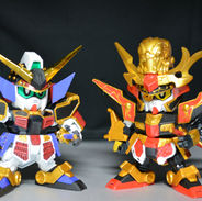 レジェンドBB体型の荒烈駆主を色々な方の作例を参考にしつつ作りました。基本は武者頑駄無、頭と肩鎧は號斗丸を使いました。兜左右の吹き返しはスクラッチしました。武神の鎧は胸は號斗丸、腰は武者頑駄無のに號斗丸のパーツを組み合わせてあります。鬼の面は磁石を仕込もうと思いましたが、断念して両面テープで付けています。