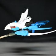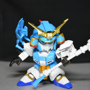 陸遜Zプラスを基に武者風雷主を作りました。元々風雷主は支援メカと合体して変形するだけですが、陸遜Zプラスのギミックを利用して支援メカを装着してそこから変形するという設定にしました。支援メカを装着する時の掛け声は他の五人衆の「○○着装」に合わせて「陣風着装」としました。右腕の砲は砲身を延長させて、デルタプラスのシールドの一部を付けて体型に合う大きさにしました。
